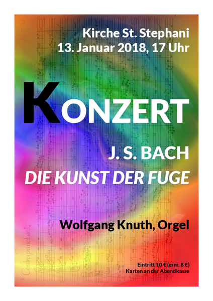 Angelehnt an die Forschungsergebnisse von Hans-Jörg Rechtsteiner (Rechtsteiner, Hans-Jörg: „Alles geordnet mit Maß, Zahl und Gewicht. Der Idealplan von Johann Sebastian Bachs Kunst der Fuge.“) spielt Wolfgang Knuth das Werk in einer eigenen Orgelfassung.